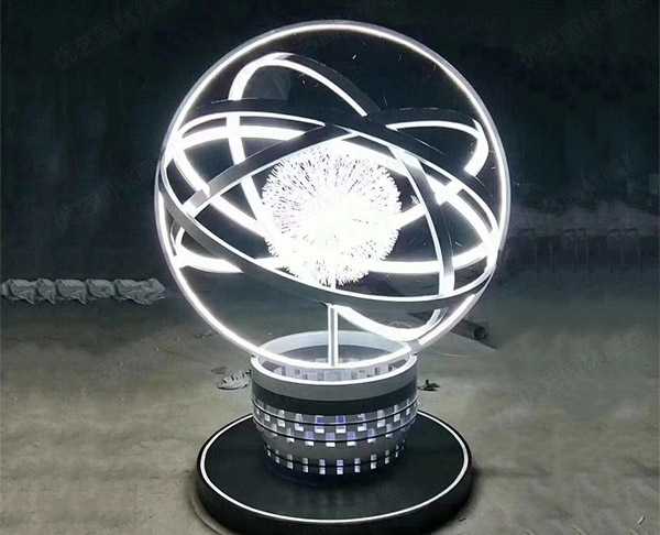 雕塑圓球底座可安置電動(dòng)軸承,通電之后可以實(shí)現(xiàn)圓環(huán)的自發(fā)光與旋轉(zhuǎn),搭配內(nèi)部的彩色光源。