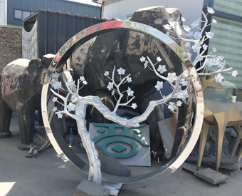 不銹鋼圓環(huán)樹枝雕塑中的圓是設(shè)計師們以天圓地方為設(shè)計理念,渾圓的圓環(huán)搭配扭曲堅韌的樹干樹枝造型,造成一種差異的美感,圓環(huán)的造型引導(dǎo)觀賞者的眼光聚焦在中間的樹木,更能突出樹木所要傳達(dá)的主題意境,同時以不銹鋼材質(zhì)為載體,把充滿生機(jī)與活力的現(xiàn)代感表現(xiàn)的淋漓盡致。