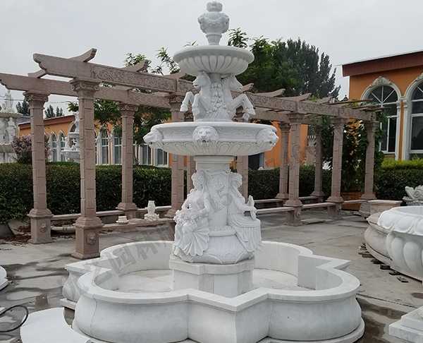 這款歐式風(fēng)格人物動(dòng)物組合大理石石雕噴泉,采用雙層設(shè)計(jì)。池中第一層四面雕刻演奏音樂(lè)的